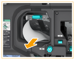 | Tournez le bouton (F-C3) dans le sens de la flèche. Si du papier est coincé, il est chargé dans le guide (F-C2). |