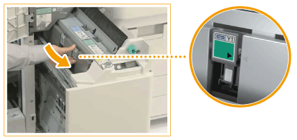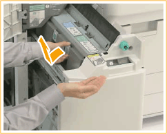 Points à vérifier avant de dégager les bourrages d'agrafesSi un bourrage papier se produit en même temps qu'un bourrage d'agrafes, dégagez d'abord le bourrage papier avant de vous occuper du bourrage d'agrafes. Avant de dégager un bourrage d'agrafes, retirez tout le papier imprimé du réceptacle à brochure. |