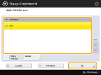 Diffusion et mise à jour des informations de périphériqueLes informations de périphérique ne peuvent pas être diffusées ou mises à jour pendant que l'appareil client traite d'autres données. Si, à l'heure programmée, un appareil client ne peut pas recevoir les informations de périphérique, aucune tentative de diffusion automatique ne s'exécute avant le cycle suivant. Réception d'informations de périphérique depuis différents modèles d'imprimantes multifonctions CanonSi l'appareil est utilisé en tant que client, il peut recevoir les informations de périphérique de différents modèles d'imprimantes multifonctions Canon. Pour cela, vous devez définir <Restr. réception infos périphérique>, dans <Réglages de réception>, sur <Non>. Notez toutefois que certaines des informations peuvent ne pas se diffuser correctement. Sélectionnez les fonctions pour recevoir les informations des appareils pourSi l'appareil est utilisé en tant que client, vous pouvez limiter les fonctions pour recevoir les informations en définissant <Restr. réception pour chq fonction>, dans <Réglages de réception>, sur <Non>. Restauration d'informations de périphériqueVous pouvez exécuter des opérations sur l'appareil client pour restaurer les informations de périphérique existant avant la mise à jour. Toutefois, vous ne pouvez restaurer que les informations existantes immédiatement avant la mise à jour. Vous ne pouvez pas restaurer d'informations plus anciennes. Notez également que les réglages de <Régl. envoi URL>, dans <Régler/mémoriser boîtes fax confid.> (<Régler/mémoriser boîtes fax confid.>), peuvent être supprimés si les données de <Val régl./enregistr.> et <Carnet d'adresses> ne sont pas restaurées simultanément. <Réglages distrib. infos périphérique> |