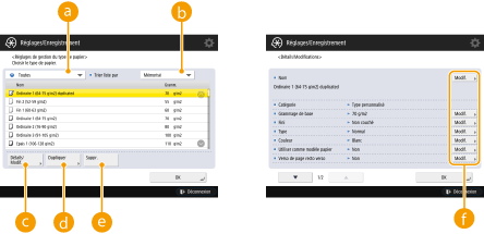 Lorsque l'on mémorise les réglages du type de papier personnalisé, veiller à modifier son nom. Il est impossible de modifier les réglages des types de papier par défaut enregistrés sur la machine. |