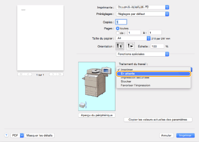 Sélectionnez [En attente] pour [Traitement du travail] dans le panneau [Fonctions spéciales].