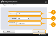 <Emplacement> s'affiche si vous sélectionnez <SMB> et <Nom d'hôte>s'affiche si vous sélectionnez <WebDAV> dans la configuration du protocole.