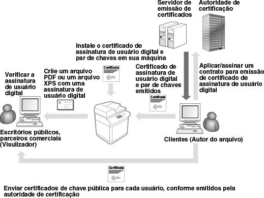 Você pode não ser capaz de registrar alguns tipos de chaves e de certificados. Especificações do sistema O certificado de assinatura de usuário digital tem uma data de validade. Se o arquivo PDF ou arquivo XPS com a assinatura de usuário digital foi criado antes da data de validade, e o usuário tenta executar a verificação após o vencimento do certificado, a assinatura do usuário digital não é mais válida. Recomendamos considerar o momento da verificação e emitir um novo certificado de assinatura de usuário digital. |