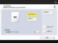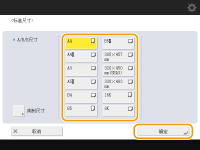 1 | 按<自定义尺寸>。 您可以将纸张尺寸指定为 <任意尺寸>,这样就不必再输入纸张尺寸设置。在添加未知尺寸的纸张用于复印时或纸张尺寸已经在打印机驱动程序中注册时指定 <任意尺寸>。 |