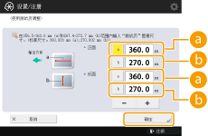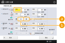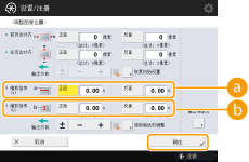 1 | 在<调整图像位置>屏幕  为<缩放倍率(a)>和<缩放倍率(b)>设置放大/缩小比率(%) 按<完成>。 <缩放倍率(a)>按照输入比率,沿着与进纸方向平行的方向放大或缩小图像。 <缩放倍率(b)>按照输入比率,沿着与进纸方向垂直的方向放大或缩小图像。 必要时,再次尝试打印出测试页纸张并检查校正量。 |
