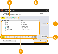 五十音または英数字を選び、宛先リストに表示される宛先を絞り込みます。頭文字にかかわらずすべて表示する場合は、<全て>を押します。