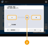 背景濃度の調整のように数値を増減させて設定するものは、<->/<+>などの左右に配置されたボタンを押して調整します。ボタンを押すたびにスライダー()が移動し、数値が増減します。ボタンを押し続けると、値をすばやく変化させることができます。
