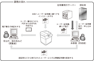 本機で作成するPDFまたはXPSにユーザー署名をつけるためには、特定認証局などから発行されたユーザー証明書と鍵ペアを本機に登録しておく必要があります。以下のような流れで運用されます。