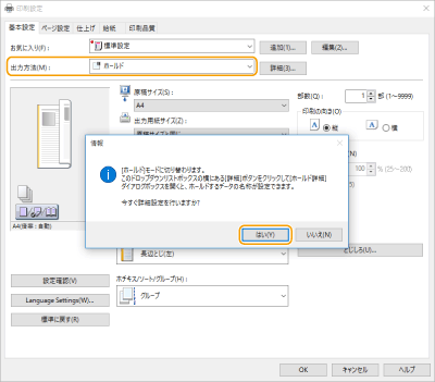 [出力方法]で[ホールド]を選び、[はい]をクリックする