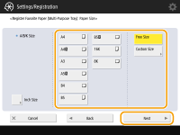 1 | Press <Custom Size>. ![]() You can specify the paper size as <Free Size>, which eliminates the need to enter the paper size setting. Specify <Free Size> when you load paper of unknown size to use for copying or when the paper size is already registered in the printer driver. |