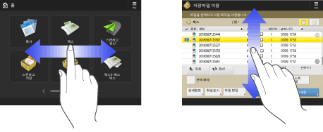 ![]() 또한 넘기기 및 집기 작동을 비활성화할 수 있습니다. <플릭/핀치 기능 사용> 이동 가능한 버튼이 있는 화면의 경우 버튼을 끌어서 놓아 이동할 수 있습니다. ![]() |