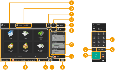 이러한 버튼을 사용하여 "복사" 및 "스캔하고 송신"과 같은 기본 기능 화면을 열 수 있습니다.