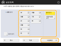 1 | <사용자설정 크기>을 누릅니다. ![]() 용지 크기를 <임의크기>로 설정할 수 있으며 용지 크기 설정을 입력할 필요가 없어집니다. 복사에 사용하기 위해 알려지지 않은 크기의 용지를 넣거나 용지 크기가 이미 프린터 드라이버에 등록되어 있는 경우 <임의크기>를 지정합니다. |
