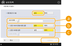 <인증 서버명 검증>서버 인증서의 일반 이름(CN)을 확인하려면 <인증 서버명 검증>을<설정>으로 선택한 후, 로그인 사용자에 의해 등록된 인증 서버의 이름을 <인증 서버명>에 입력합니다.