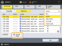 (상황확인/중지)를 누르면 상태 모니터 화면이 표시됩니다. 이 화면에서 복사, 인쇄, 이메일 전송, 팩스/I-팩스 송신/수신, "고급 박스"에 파일 저장 등과 같은 각 기능에 대한 사용 기록을 확인할 수 있습니다. 또한 이 화면에서 각 기능에 대한 사용 기록을 인쇄할 수 있습니다.![]() |