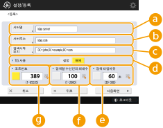 2 | 필수 정보를 입력합니다. ![]() <서버명>LDAP 서버 이름을 입력합니다. <서버주소>영숫자를 사용하여 LDAP 서버의 IP 주소나 호스트 이름을 입력합니다(예: "ldap.example.com"). ![]() <서버주소>와 DNS 기기부터 LDAP 서버까지 수신인 검색을 수행할 때 에러를 방지하려면 다음에 유의합니다. IP 주소를 입력할 때, 사용 가능한 DNS 서버가 정방향 조회만 지원하는지 확인합니다. DNS 서버가 정방향 조회만 지원하는 경우 4단계에서 <인증 정보>의 <사용안함> 또는 <사용함>을 누릅니다. <사용함 (보안인증)>을 선택할 때, DNS 서버가 역방향 조회를 지원하는지 확인합니다. <검색시작 위치>LDAP 서버의 디렉토리 트리에서 검색 시작 위치를 지정합니다. LDAPv3의 경우에 기기가 서버 설정을 자동으로 검색하기 때문에 설정을 건너뛸 수 있습니다. LDAPv2의 경우는 항상 지점을 지정합니다. ![]() <검색시작 위치>의 형식 입력 Windows Server를 사용할 경우 Active Directory의 도메인 이름을 점 "."으로 구분된 문자열 단위로 입력합니다. 각 단위에 대해 "DC="를 추가하고 콤마 ","로 분리합니다. 예: 도메인 이름이 "john.example.com"이면 "DC=john,DC=example,DC=com"을 입력합니다. Lotus Notes Domino를 사용할 경우 "cn=user1,ou=team1,ou=salesdept,o=canon" 같은 디렉토리 트리 노드 식별 이름(dn)을 입력합니다. <TLS 사용>TLS를 사용하여 LDAP 서버와 주고 받는 통신을 암호화하려면 <설정>을 누릅니다. <검색 타임아웃>검색 지속 시간을 초 단위로 지정합니다. <검색할 수신인의 최대수>검색 가능한 수신인 수를 지정합니다. <포트번호>LDAP 서버와 통신을 주고 받을 때 사용할 포트 번호를 입력합니다. |