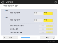 DNS 서버 주소, DNS 호스트 이름, DNS 도메인 이름을 지정합니다. ![]() ![]() <주 DNS서버>와 <보조 DNS서버>를 누르고, DNS 서버에 대한 IPV4/IPv6 주소를 입력한 후 <다음화면>를 누릅니다. DNS 서버 주소 설정에 대한 정보는 DNS 설정 구성을 참조하십시오. ![]() ![]() 기기 이름(호스트 이름)을 입력하려면 <호스트명>를 누릅니다. <도메인명>를 눌러 기기가 속한 도메인 이름을 입력한 후, <다음화면>를 누릅니다. IPv4 및 IPv6 설정이 같은 경우, <IPv4와 같은 호스트명/도메인명을 사용>를 위해 <설정>를 누릅니다. ![]() ![]() DNS 동적 업데이트 설정을 사용하여 자동으로 업데이트하려면 <DNS 동적 업데이트>를 위해 <설정>를 누른 후, <확인>를 누릅니다. <IPv6>를 위한 <DNS 동적 업데이트>를 <설정>에 설정하려면, 자동으로 등록할 항목을 위해 <설정>를 선택하십시오. | |