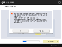다음 경우에는 설정 가이드를 시작할 수 없습니다.사용자 인증 혹은 부서 ID 인증이 설정된 경우 부서 ID 인증이 설정된 경우 카드 인증이 실행되는 경우 |