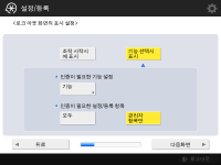 팩스 기능을 사용하기 위한 필수 설정을 지정합니다. ![]() 기기에 팩스 기능이 없는 경우 11단계로 진행합니다. 선택 화면이 나타나면 국가/지역을 선택하고 <다음화면>를 누릅니다. ![]() ![]() 팩스 번호를 입력하고 <다음화면>를 누릅니다. 팩스 설정에 대한 정보는 팩스 회선 설정를 참조하십시오. ![]() ![]() <설정>를 누르고, 사용자 이름을 입력한 후 <다음화면>를 누릅니다. ![]() ![]() 회선 종류를 선택하고 <확인>를 누릅니다. | |