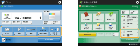 コピー、ファクス、スキャンの基本画面に表示されている設定ボタンを、他の設定ボタンに変更することができます。また、ログインしているユーザーによって異なる基本画面を表示させることもできます。