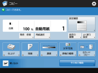 倍率、コピーする用紙、部数などの設定状況が表示されます。正しくコピーするために、必ずここの設定内容を確認してください。設定を変更するときは、表示部の下にあるボタンを押します。コピーの基本操作