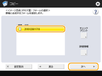 両面コピー時に、フォーム画像をウラ面に合成する場合は、<ウラ面>を設定してください。オモテ面と同じフォーム画像を合成する場合は<オモテ面と同じ>を押し、オモテ面と異なるフォーム画像を合成する場合は、<設定>を押して手順5に進んでください。