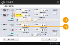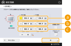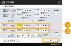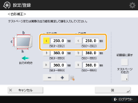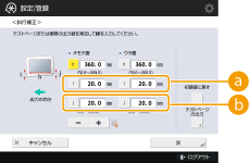 3 | 実測値<b><h>をオモテ面、ウラ面とも入力する ![]() <b>テストページの<b>の長さの実測値を入力します。 <h>テストページの<h>の長さの実測値を入力します。 例に挙げたとおり<b>の長さを360.0 mm、<h>の長さを355.5 mmに設定すると、差分である0.5 mm分のゆがみは自動的に補正されます。 |