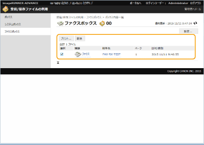 [ファクスボックス]を選び、ファクスボックスの番号をクリックする