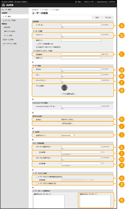dc | × | 0文字以上32文字以内 | 制御文字 | - (なし) | 変更できません。以下の方法でユーザー登録された場合に自動付与されます。 サーバー認証後に登録されたユーザー シンプルログインの<ジョブ投入時に自動で登録>で登録されたユーザー |