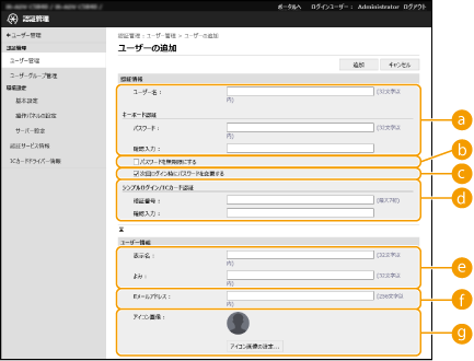 [パスワード :]、[暗証番号 :]、[アイコン画像 :]は、一般ユーザーが自分で変更することも可能です。
