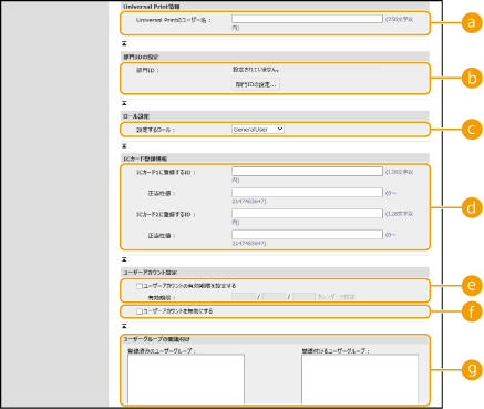 [部門ID :]部門別ID管理を併用するときは、[部門IDの設定]をクリックし、一覧からユーザーを所属させる部門IDを選ぶ必要があります。まず、一覧画面の[新規部門の登録]から必要な部門IDを登録してください。ここで選んだ部門IDを削除したときは、必ず設定を変更してください。