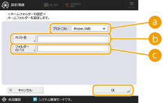 2 | ホームフォルダーを指定し、<OK>を押す ![]() <プロトコル>マイフォルダー参照時に送信する際に使用するプロトコルを選びます。 <ホスト名>ホームフォルダーのあるパソコンのコンピューター名またはIPアドレスを入力します。 <フォルダーのパス>ホームフォルダーへのパスを入力します。たとえば、ホームフォルダーがC:ドライブの[パブリック]フォルダー内に作成したサブフォルダー「share」(パス:「C:\users\public\share」)のときは、「users\public\share」と入力します。 ![]() パスの階層が深すぎると指定できない場合があります。 |