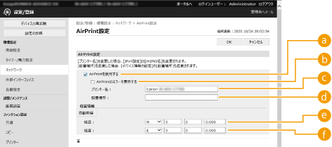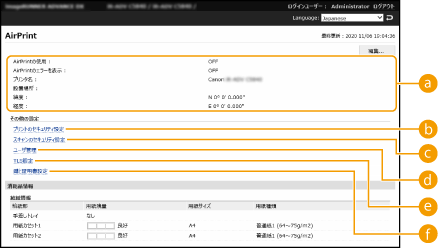 管理者権限でログインするとAirPrint専用ページからも、AirPrint設定を変更することができます。