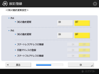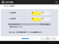 ネットワークに接続するための設定をします。 ![]() ![]() <IPv4を使用>または<IPv6を使用>の<ON>を押し、<次へ>を押します。IPv4/IPv6両方を使用することもできます。 <IPv4を使用>と<IPv6を使用>を<OFF>にして<OK>を押すと、ネットワークの設定を行わずにStep 10へ進みます。 ![]() <IPv4を使用>を<ON>にした場合は、次の設定を行います。 ![]() IPアドレスを自動で取得する場合は、<DHCP>または<Auto IP>を押し、<次へ>または<OK>を押します。 IPアドレスを手動で設定する場合は、<DHCP>または<Auto IP>の選択を解除して、<IPアドレス>、<サブネットマスク>、<ゲートウェイアドレス>を押してそれぞれ入力し、<次へ>または<OK>を押します。 IPv4アドレスの設定について詳しくは、IPv4アドレスを設定するを参照してください。 ![]() <IPv6を使用>を<ON>にした場合は、次の設定を行います。 ![]() ステートレスアドレスを使用する場合は<ON>/使用しない場合は<OFF>を押し、<次へ>を押します。 IPv6アドレスの設定について詳しくは、IPv6アドレスを設定するを参照してください。 ![]() ステートレスアドレスを設定したあと、次の設定を行います。 ![]() 手動アドレスを使用する場合は<ON>/使用しない場合は<OFF>を押し、<次へ>を押します。 手動アドレスを使用する場合は、<手動アドレス>、<プレフィックス長>、<デフォルトルーターアドレス>を押してそれぞれ入力します。 ![]() 手動アドレスを設定したあと、次の設定を行います。 ![]() DHCPv6を使用する場合は<ON>/使用しない場合は<OFF>を押し、<OK>を押します。 | |