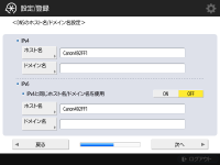 DNSサーバーアドレスやDNSのホスト名/ドメイン名などを設定します。 ![]() ![]() <プライマリーDNSサーバー>、<セカンダリーDNSサーバー>を押して、DNSサーバーのIPv4/IPv6アドレスを入力し、<次へ>を押します。 DNSサーバーアドレスの設定などについて詳細は、DNSの設定をするを参照してください。 ![]() ![]() <ホスト名>を押して本機の名称(ホスト名)を、<ドメイン名>を押して本機が属するネットワークドメイン名を入力し、<次へ>を押します。 IPv4とIPv6が同じ設定になる場合は、<IPv4と同じホスト名/ドメイン名を使用>の<ON>を押してください。 ![]() ![]() DNSの動的更新で自動登録する場合は、<DNSの動的更新>を<ON>にして、<OK>を押します。 <IPv6>の<DNSの動的更新>を<ON>にした場合は、自動登録する項目を<ON>にします。 | |