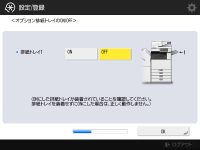 <オプション排紙トレイのON/OFF>画面が表示された場合は、追加で装着した排紙トレイを使用するかどうかを設定します。 ![]() <日付/時刻の設定>画面が表示された場合は、Step 6に進みます。 ![]() 排紙トレイを使用する場合は<ON>/使用しない場合は<OFF>を押し、<OK>を押します。 装着されているオプションによって、表示される項目が異なります。 | |