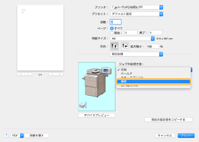 [特別処理]パネルの[ジョブの処理方法]で[保存]を選ぶ