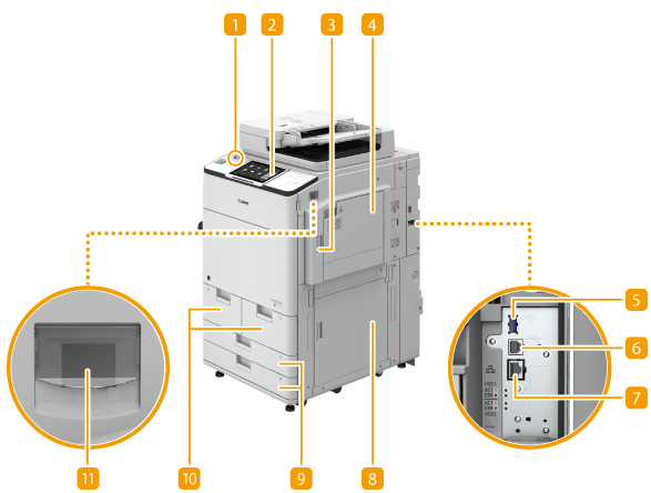 You can connect a USB memory device to the USB port located on the left side of the control panerl, and directly print data from the USB memory device. Originals scanned using the machine can also be saved directly to the USB memory device.