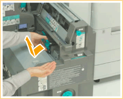Push the saddle stitcher unit back into the machine, and close the front cover of the finisher.