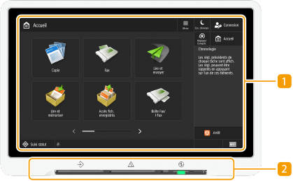 Appuyez sur la touche pour vérifier l'état de l'impression ou de la télécopie ou pour consulter l'historique de l'appareil. Vous pouvez également examiner l'état de l'appareil et déterminer, par exemple le nombre de feuilles de papier et la quantité de toner disponibles ou voir si des erreurs se sont produites.