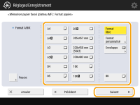 1 | Appuyez sur <Format personnalisé>. ![]() Vous pouvez spécifier la taille de papier <Format libre>, vous n'aurez alors pas besoin d'indiquer le réglage de la taille de papier. Spécifiez <Format libre> lorsque vous chargez du papier de taille inconnue pour faire des photocopies ou lorsque la taille de papier est déjà enregistrée dans le pilote de l'imprimante. |