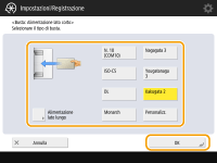2 | Selezionare l'orientamento e il tipo di busta. ![]() Se è stato modificato il posizionamento delle buste, premere <Alimentazione lato corto> o <Alimentazione lato lungo> e selezionare il tipo di busta. Per registrare una busta in formato personalizzato, premere <Personalizz.> <Avanti> quindi <X> o <Y> per specificare il lato, quindi utilizzare i tasti numerici per inserire la lunghezza del lato specificato. |