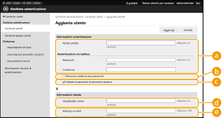 Selezionare la casella di controllo per impostare la password dell'utente da registrare senza data di scadenza. Questa impostazione può essere specificata quando [Periodo validità password] è impostato su [Off] in [Criteri impostazioni password] in [Autenticazione] in [Impostazioni criteri di protezione].