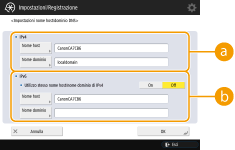 2 | Eseguire le impostazioni necessarie. ![]() <IPv4>Premere <Nome host> e inserire il nome host della macchina da registrare sul server DNS usando caratteri alfanumerici. Premere <Nome dominio> e inserire il nome di dominio a cui appartiene la macchina usando caratteri alfanumerici (esempio: "esempio.com"). <IPv6>Per impostare il nome host e il nome di dominio affinché siano gli stessi di IPv4, premere <On> in <Utilizzo stesso nome host/nome dominio di IPv4>. Per impostarli in modo che siano diversi da quelli di IPv4, premere <Off>. Per impostare il nome host in modo che sia diverso dall'IPv4, premere <Nome host> e inserire il nome host della macchina da registrare sul server DNS usando caratteri alfanumerici. Per impostare il nome di dominio in modo che sia diverso dall'IPv4, premere <Nome dominio> e inserire il nome di dominio a cui appartiene la macchina usando caratteri alfanumerici (esempio: "esempio.com"). ![]() Se si imposta <Utilizzo DHCPv6> su <On> per le impostazioni dell'indirizzo stateful (Impostazione di un indirizzo IPv6), il nome di dominio configurato manualmente viene sovrascritto. Se si imposta <Utilizzo stesso nome host/nome dominio di IPv4> su <On>, viene utilizzato il nome di dominio recuperato dal server DHCPv6. |