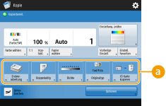 Die auf dem Grundfunktionsbildschirm (für Kopieren, Faxen und Scannen) angezeigten Einstelltasten können mit den übrigen Einstelltasten unter <Optionen> geändert werden. Durch Platzieren der häufig verwendeten Einstelltasten auf dem Grundfunktionsbildschirm können Sie die Funktionen effizienter nutzen. Zudem können Sie durch die Anmeldung mit persönlicher Authentisierungsverwaltung verschiedene, an die jeweiligen Grundfunktionsbildschirme angepasste Benutzer anzeigen.