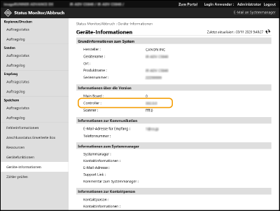 Prüfen Sie die angezeigte Version in [Controller] unter [Informationen über die Version].
