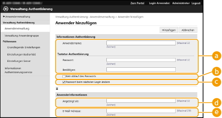 [Kein Ablauf des Passworts]Aktivieren Sie das Kontrollkästchen, um das Passwort des zu registrierenden Benutzers so festzulegen, dass es kein Ablaufdatum hat. Diese Einstellung können Sie festlegen, wenn [Zeitspanne Gültigkeit Passwort] auf [Aus] unter [Einstellungen Passwort-Richtlinie] in [Authentisierung] in den [Einstellungen Sicherheitsrichtlinie] festgesetzt ist.