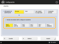 La autenticación se puede hacer de forma más segura codificando el intercambio de datos. Si se emplea esta medida, la versión de LDAP y el código de caracteres se establecen como <Ver.3 (UTF-8)>. Hay que sincronizar el equipo y el servidor LDAP.