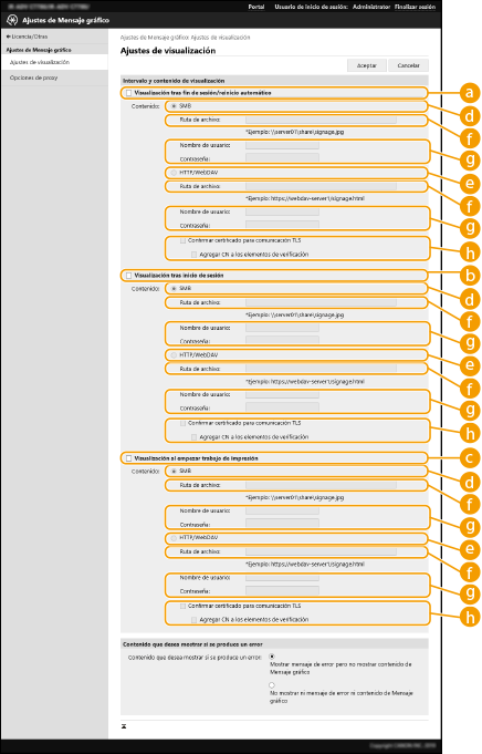 Especifique en la función Mensaje visual las mismas opciones de proxy configuradas en <Opciones de proxy>. Si se configura un proxy, es posible que el contenido especificado no aparezca. Si esto ocurre, configure una dirección excluida para que el servidor proxy no se utilice.