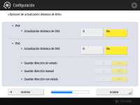 Especifique la dirección del servidor DNS, el nombre del host DNS y el nombre del dominio DNS. ![]() ![]() Pulse <Servidor DNS primario> y <Servidor DNS secundario>, introduzca la dirección IPV4/IPv6 para el servidor DNS y pulse <Siguiente>. Para obtener información sobre las opciones de la dirección del servidor DNS, consulte Configurar opciones de DNS. ![]() ![]() Pulse <Nombre de host> para introducir el nombre del equipo (nombre de host). Pulse <Nombre de dominio> para introducir el nombre de dominio al que pertenece el equipo, y pulse <Siguiente>. Si las opciones de IPv4 y IPv6 son iguales, pulse <Sí> para <Usar el mismo nombre de host/nombre de dominio que para IPv4>. ![]() ![]() Para actualizar automáticamente mediante las Opciones de actualización dinámica de DNS, pulse <Sí> para <Actualización dinámica de DNS>, y pulse <Aceptar>. Si configura <Actualización dinámica de DNS> para <IPv6> como <Sí>, seleccione <Sí> para registrar los elementos automáticamente. | |